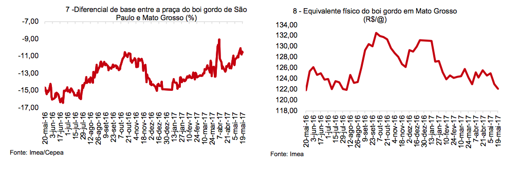 – O diferencial de base MT-SP aumentou 0,51 p.p. nesta semana, visto que o preço em Mato Grosso se manteve estável e em São Paulo recuou 0,67% no comparativo semanal.
