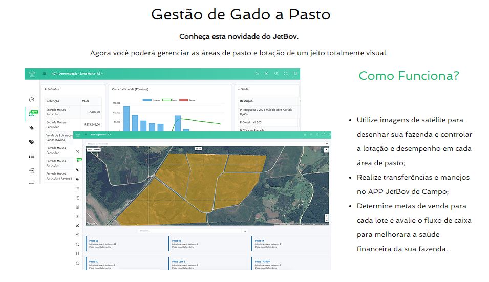 O aplicativo faz a gestão da fazenda da cria até a terminação, a pasto, no semi-confinamento ou confinamento. Além disso, faz a gestão de Gado a Pasto de uma forma totalmente visual.