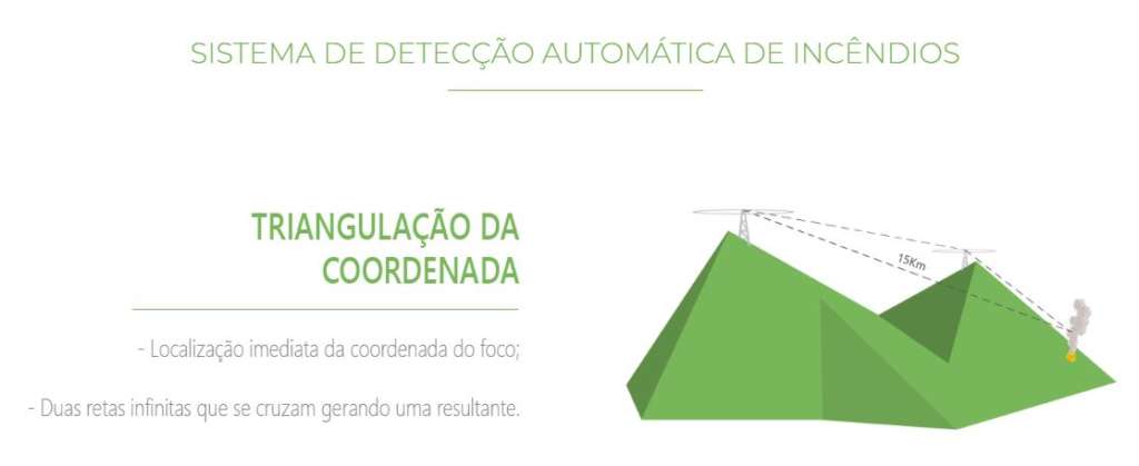 A precisão da tecnologia está na triangulação coordenada – duas retas infinitas que se cruzam formando o resultante: coordenadas precisas de localização do foco de incêndio. Um alerta é emitido e se o operador da rede de monitoramento confirmar o foco é possível emitir alarme diretamente para corpo de bombeiros. Outro diferencial da solução está nos algoritmos exclusivos e equipamentos, que permitem a independência de sinal externo, o que assegura e facilita a otimização da captura e transmissão dos dados.