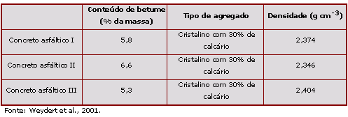 Os tipos de concreto, concreto asfáltico e mastic asfáltico utilizados nesse ensaio estão apresentados nas Tabelas 2, 3 e 4, respectivamente, com suas principais características.