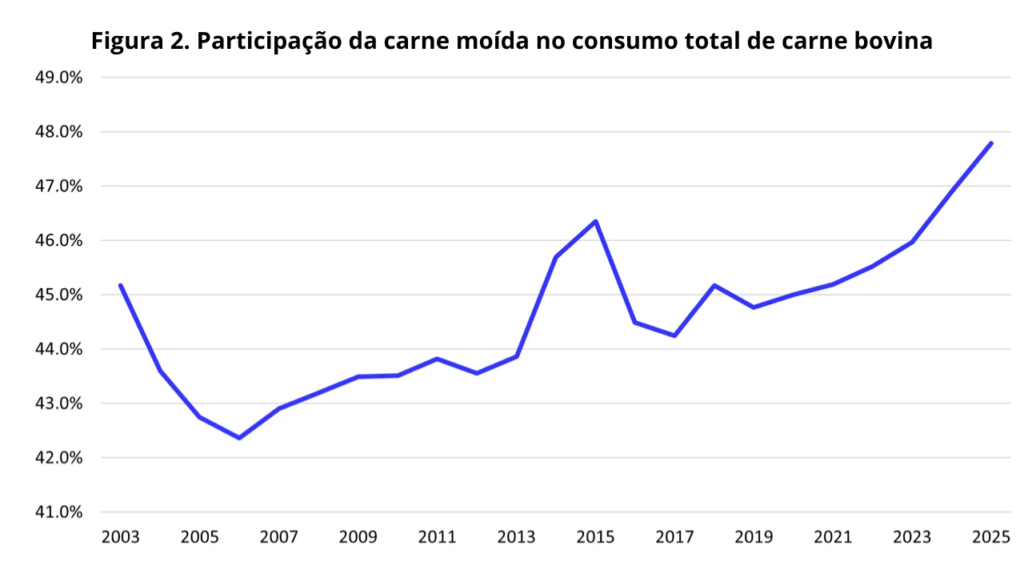 Uma análise detalhada do consumo de carne bovina mostra que a oferta per capita de carne moída aumentou em 2025 para o nível mais alto desde 2004. A oferta de carne moída foi estimada em 13 quilos por pessoa, aumento de aproximadamente 277 gramas por pessoa. O consumo restante de carne bovina (carcaça) foi estimado em 14,2 quilos, queda de cerca de 200 gramas por pessoa (Figura 1).
