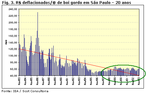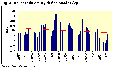 O bom desempenho das exportações tem exercido papel fundamental na sustentação dos preços internos. Acompanhem na figura 3 a evolução da cotação do boi gordo paulista em reais deflacionados pelo IGP-DI.