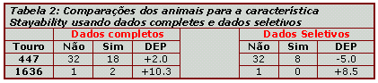 Para o animal de numero 447 foram retirados ou deletados 10 informações ou observações para o sucesso de sobreviver até a idade de 6 anos de idade, a Stayability e as DEPs do touro mudaram de 2.0 para – 5.0, enquanto deletando dois dados no touro 1636 mudou a DEP de 10.3 para 8.5. Mais uma vez vale lembrar que as DEPs positivas seriam as mais favoráveis ou desejadas para esta característica. Em ambos os casos, dados apresentados seletivamente, poderiam estar levando a seleção errônea de animais para a reprodução. Estes exemplos simples são confirmados no estudo de Mallinckrodt et al. (1995). Nesse estudo, o autor demonstra que o uso de dados selecionados resulta em uma importante redução nas correlações entre os verdadeiros valores genéticos dos animais e suas respectivas DEPs.