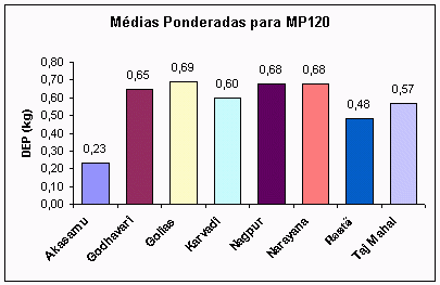 Figura 1: Médias ponderadas (machos e fêmeas) para habilidade materna (DEP MP120), nas oito linhagens consideradas.