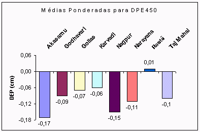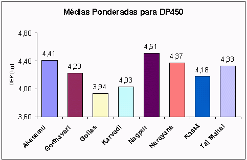 Figura 2: Médias ponderadas (machos e fêmeas) para crescimento pós-desmama (DEP DP450), nas oito linhagens consideradas.