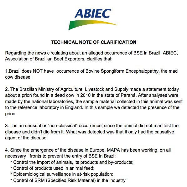 ABIEC (Brazil) – Technical note of clarification about an alleged occurrence of BSE