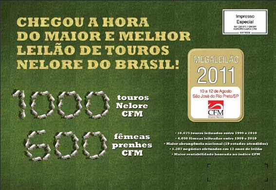O Encontro técnico faz parte da programação do Megaleilão CFM 2011, com a maior oferta de touros CEIP do país, no dia seguinte ao encontro (11/ago), acontecerá o Megaleilão de 400 touros Nelore de alto Índice CFM e cerca de 600 fêmeas prenhes. E fechando a programação, dia 12 de agosto, a Agro-Pecuária CFM abrirá a Megaloja, pondo a venda 600 touros Nelore, onde todos os animais do Megaleilão e Megaloja têm o CEIP.