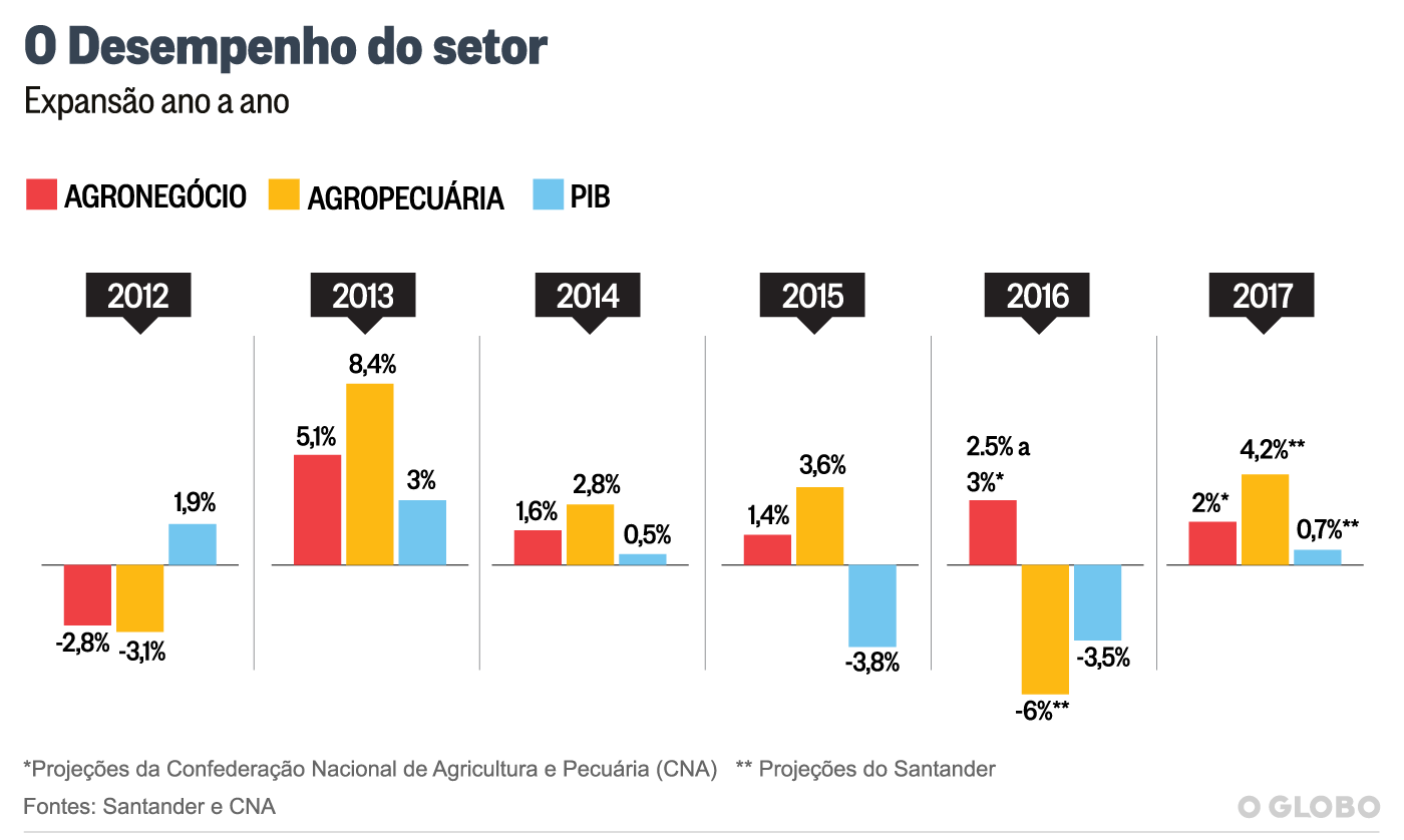 De acordo com o Banco Santander, o setor, que engloba além da agropecuária, insumos, agroindústria e serviços ligados a essa cadeia, deve ser responsável por metade do magro crescimento econômico previsto para o país em 2017, de 0,7% nas contas do banco (o mercado espera 0,5%).