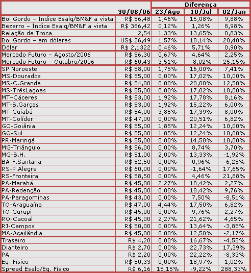 Na última sessão, o número de contratos em aberto para agosto/06 aumentou em 1.290 posições, para o total de 4.367 contratos em aberto. Em relação ao tipo de participante, a pessoa jurídica financeira aumentou de 3.341 para 5.207 na compra (geral, para todos os contratos no boi).