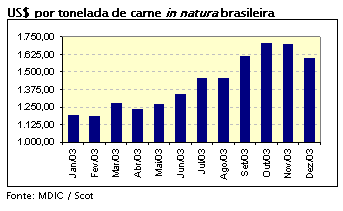No acumulado de 2003 o preço da tonelada da carne brasileira in natura acumulou alta superior a 30%. Não bastasse, o câmbio voltou para patamares superiores a R$2,90 por US$1,00, contribuindo ainda mais com as vendas dos exportadores.