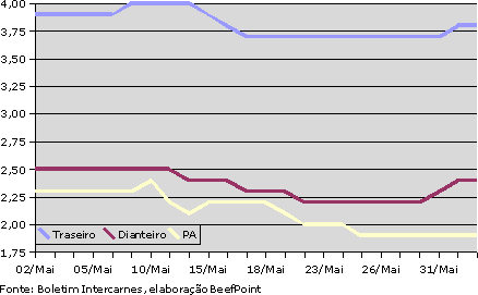 Na sexta-feira feira, o traseiro estava sendo negociado a R$ 3,80/Kg (1×1 e avulso). O dianteiro foi negociado na faixa de R$ 3,30 a 3,40/Kg (1×1). A ponta de agulha do boi se manteve estável durante toda a semana em R$ 1,90/Kg. A oferta de PA vem se mostrando excessiva. Os preços perderam sustentação a partir da segunda quinzena de maio, resultado de demanda retraída, característica de final de mês, combinada com uma oferta excessiva.
