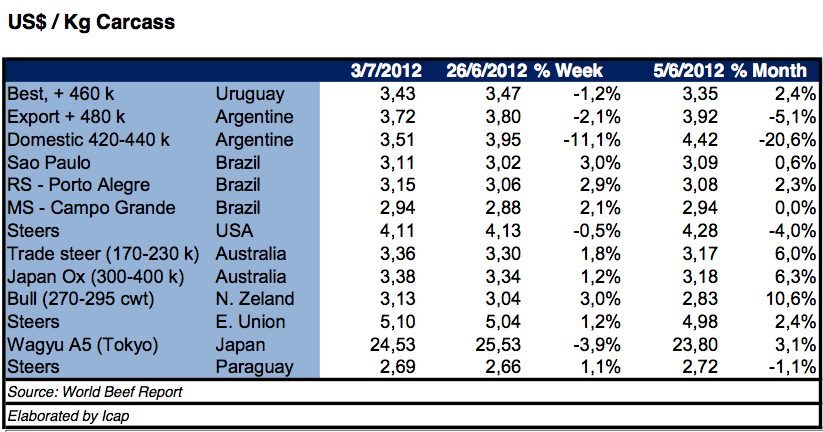 Em trinta dias, o preço do boi gordo pelo mundo teve valorização, exceto pela Argentina, EUA e Paraguai. Na Argentina, o preço do quilo da carcaça caiu 5,1% para o mercado de exportação (US$3,72) e mais de 20% para o mercado interno (US$3,51). Nos EUA o preço caiu 4% ficando a US$4,11. Mesmo com a queda ainda é o segundo maior valor entre os países levantados. O maior valor fica na União Europeia, a US$5,10 e valorizado em 2,4% desde o dia 05/jun.