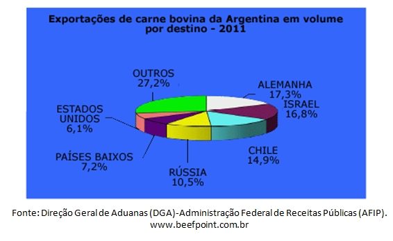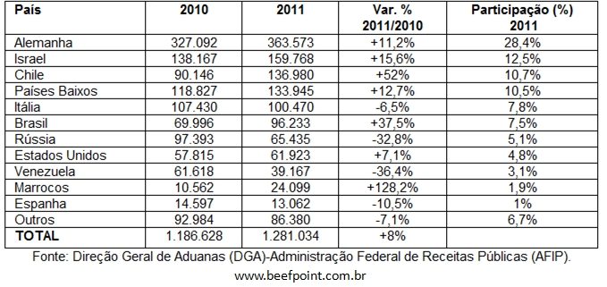 A Alemanha foi o principal destino em volume para a carne bovina argentina durante 2011, com aproximadamente 25,8 mil toneladas, seguida por Israel, seguida por Israel, com 25 mil toneladas e depois pelo Chile, com 22,2 mil toneladas. Em valor, o principal mercado durante 2011 foi a Alemanha, que explica mais de um quarto (28,4%) do total do valor exportado no período, seguido por Israel (12,5% do total) e Chile (10,7%).