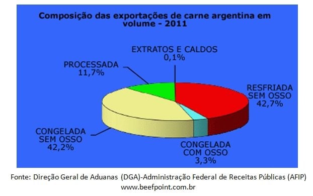 As exportações de carne bovina da Argentina durante dezembro de 2011 finalizaram em volumes inferiores aos de novembro e também com relação a dezembro de 2010. Com relação a nov/11, as exportações caíram em volume 38% e com relação a dezembro de 2010, a queda foi de 37,8%.