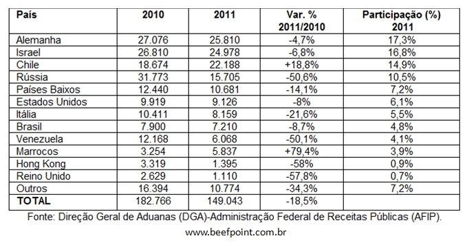 Comparando-se as exportações de 2011 com as de 2010, houve um comportamento onde predomina uma tendência de baixa nos volumes exportados com relação aos níveis de atividade registrados nos principais destinos no ano anterior. Mostraram volumes superiores aos registrados em 2010 os mercados do Chile (+18,8%) e de Marrocos (+79,4%). As quedas mais significativas ocorreram para a Rússia (-50,6%), destino para onde as exportações caíram mais de 15.000 toneladas, a Venezuela (-50,1%) e a Hong Kong (-58%).