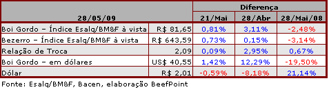 Diante da dificuldade em adquirir a matéria-prima, muitos frigoríficos precisaram alterar os preços e, nesta quinta-feira, o indicador Esalq/BM&FBovespa boi gordo à vista foi cotado a R$ 81,65/@, como valorização de 0,81% na semana. O indicador a prazo teve alta de 0,78%, sendo cotado a R$ 82,40/@. Apesar da alta, o preço ainda está 3,07% abaixo do registrado no mesmo período do ano passado, em 28 de maio de 2008 a arroba do boi gordo era cotada a R$ 85,01/@.
