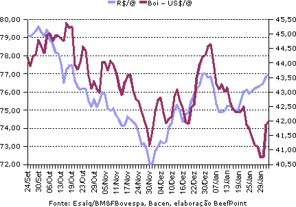 A arroba do boi gordo teve uma semana de alta com o indicador Esalq/BM&FBovespa boi gordo à vista apresentando variação acumulada de +1,04%, sendo cotado a R$ 76,99/@ na quarta-feira. O indicador a prazo foi cotado a R$ 77,93/@, com valorização de 1,06% no mesmo período (27/01 a 03/02). Mesmo com esta alta em janeiro preço da arroba para pagamento com 30 dias acumulou recuo de 0,86%.