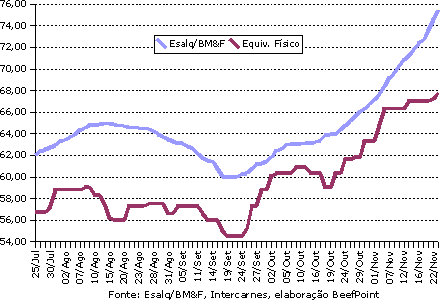 Nesta sexta-feira, o indicador Esalq/BM&F boi gordo à vista foi cotado a R$ 75,48/@, alta de R$ 0,87. O indicador a prazo se valorizou R$ 0,82, com cotação de R$ 76,27/@. Na BM&F, todos os contratos acompanharam o movimento do mercado físico e fecharam em alta. O primeiro vencimento, novembro/07, que se encerra essa semana, fechou a R$ 76,00/@ (+R$ 0,54), com 1.351 contratos negociados e 9.780 contratos em aberto. No mercado físico, o preços continuam subindo frente a pouca oferta de animais prontos para abate.