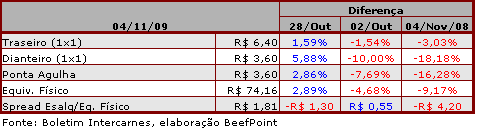Gráfico 2. Indicador Esalq/BM&FBovespa e contratos futuros de boi gordo (valores à vista), em 28/10/09 e 04/11/09