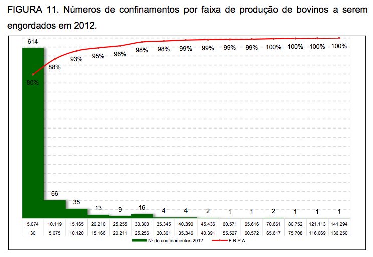 Na distribuição estimada da produção de gado confinado em 2011, 8% dos confinamentos (68 propriedades) concentram 52% do total confinado, enquanto que 92% dos confinamentos são responsáveis pelos outros 48%, assim, 612 unidades de engorda foram responsáveis pela produção média de 1.106 animais / propriedade. Ao participarem também de um questionário online os confinadores responderam como principal empecilho dentro da porteira os altos custos dos insumos e, fora da porteira, a aprovação urgente de uma política nacional que estabeleça faixas de bonificações na tipificação de carcaça.