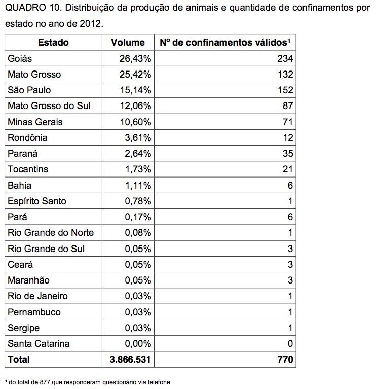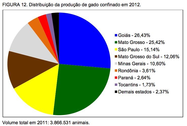 Comparando a produção de anos anteriores, em 2010, o total de gado confinado no Brasil foi de 2,05 milhões; em 2011, o volume confinado foi de 3,36 milhões e, em 2012, a estimativa projetada foi de 3,86 milhões de cabeças.