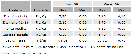 Cotações do atacado de carne bovina, de acordo com o Boletim Intercarnes.