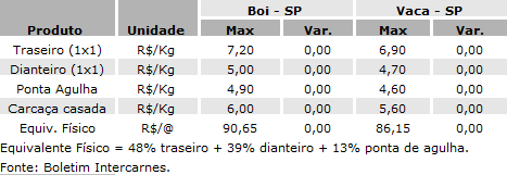 Cotações do atacado de carne bovina, de acordo com o Boletim Intercarnes.