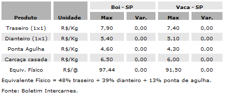 Cotações do atacado de carne bovina, de acordo com o Boletim Intercarnes.