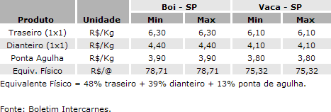 Cotações do atacado de carne bovina, de acordo com o Boletim Intercarnes.
