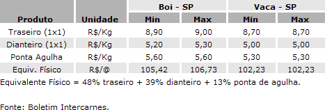 Cotações do atacado de carne bovina, de acordo com o Boletim Intercarnes.