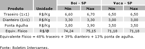 Cotações do atacado de carne bovina, de acordo com o Boletim Intercarnes.