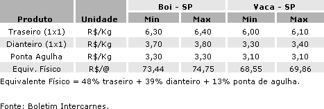 Cotações do atacado de carne bovina, de acordo com o Boletim Intercarnes.