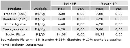 Cotações do atacado de carne bovina, de acordo com o Boletim Intercarnes.
