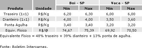 Cotações do atacado de carne bovina, de acordo com o Boletim Intercarnes.