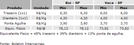 Cotações do atacado de carne bovina, de acordo com o Boletim Intercarnes.