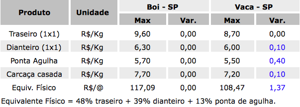 Cotações do atacado de carne bovina, de acordo com o Boletim Intercarnes.