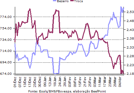 O indicador Esalq/BM&FBovespa boi gordo à vista foi cotado a R$ 104,23/@, com valorização de R$ 0,05. O indicador a prazo registrou retração de R$ 0,69, sendo cotado a R$ 104,99/@.