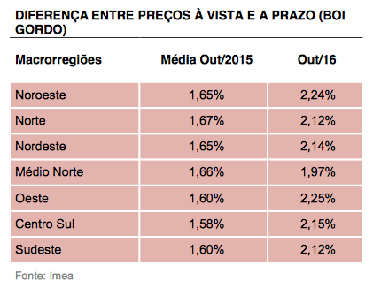 A prazo ou à vista? Apesar de contarem com diversas maneiras de negociações (a termo, hedge, opção, etc.) para se resguardarem de riscos, os participantes do mercado da bovinocultura de corte mato-grossense se utilizam basicamente de duas formas: à vista ou a prazo. E há uma discrepância entre esses indicadores. Até pouco tempo atrás existia uma “convenção” de mercado que indicava que o preço pago à vista pela arroba do boi gordo seria R$ 2,00 menor que o valor pago a prazo, no entanto, nos últimos meses esse padrão tem se alterado, e essa diferença chegou a atingir R$ 2,78 em setembro/16. O principal motivo para este aumento na diferença parte dos frigoríficos e deve-se ao fato de que as vendas de carne bovina para o atacado são feitas, em sua grande maioria, a prazo, e estas se apresentaram ruins nos últimos meses. Desta forma, com o cenário interno registrando poucas alterações, a diferença entre tais indicadores pode permanecer elevada.