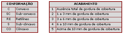 Na avaliação das carcaças, aplicando-se as normas de tipificação preconizada pela Portaria Ministerial no 612 de 05/10/89, aparecem os bovinos dos dois grupos reunidos na conformação retilínea, porém com pequena vantagem dos inteiros, que no período, tiveram um melhor desenvolvimento muscular em relação aos castrados.