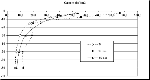 Pelos teores de Ca ao longo do perfil do solo (Figura 3), percebe-se sua movimentação, atingindo maior valor em profundidade aos 90 dias, vindo a reduzir-se novamente aos 180 dias. Tal fato pode ser explicado pela ação conjunta da lixiviação do Ca e da remoção pelas plantas existentes. Esse comportamento confirma que a máxima reação do calcário ocorre por volta de 90 dias, sendo necessária então a antecedência da calagem em relação à semeadura ou plantio.