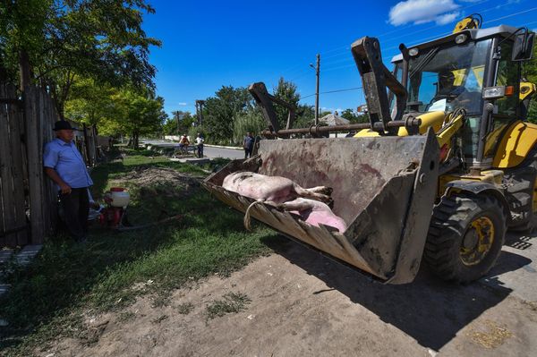 Uma escavadeira move porcos abatidos no sul da Romênia após a epidemia de peste suína africana, em agosto de 2018. Fotógrafa: Daniel Mihailescu / AFP via Getty Images