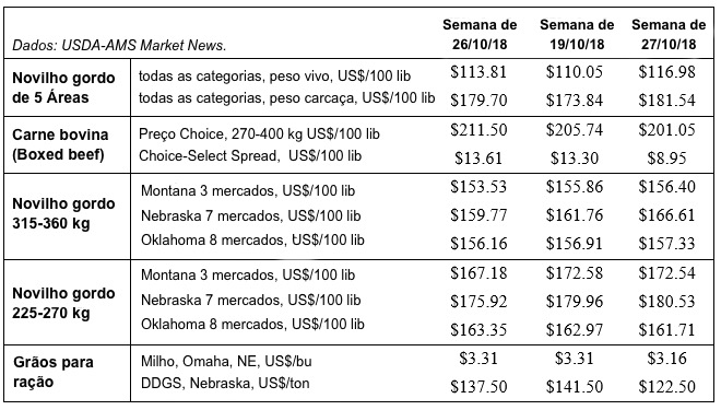 Na última semana de outubro, os preços do gado subiram devido aos preços mais altos da carne bovina. Os preços da carne bovina Choice aumentaram e os frigoríficos puderam aumentar os preços das ofertas de animais vivos. O spread Choice/Select aumentou para o mais alto em 10 anos em outubro.