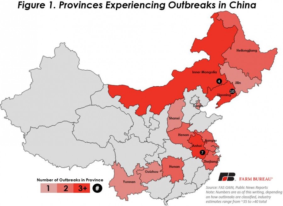 “Então, a capacidade de conter a propagação da peste suína africana na China é muito baixa”, disse ele. “Há pelo menos 23 casos confirmados na China, o que significa, como todos sabemos, que há muito mais do que isso. Se você observar a dispersão geográfica desses casos, estará em quase todo o país. ”