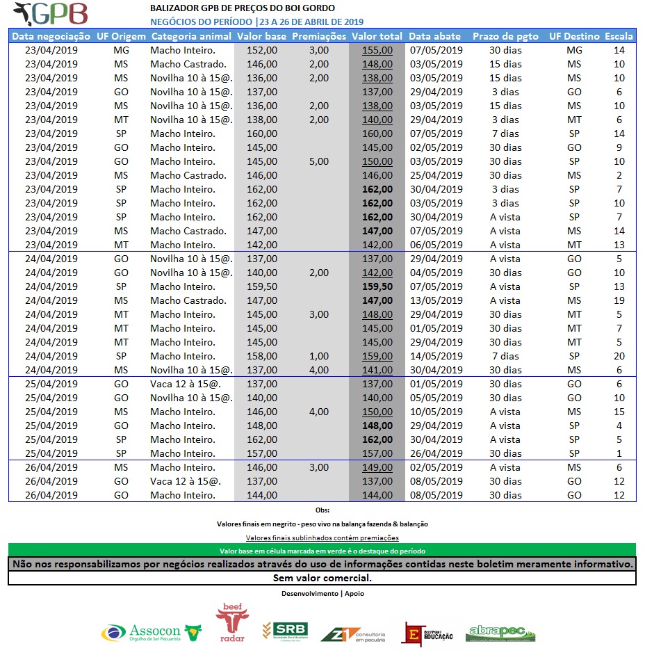 • Balizador de Preços do Boi Gordo GPB – Boletim de 29-abril-2019
