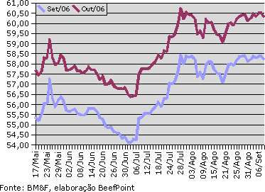 O boi gordo fechou com a maioria dos contratos futuros em baixa na última sessão, com um bom volume de negócios e muitos "stops de posição" nos dois primeiros vencimentos. O primeiro vencimento ajustou em R$ 58,20/@ e outubro/06 em R$ 60,30/@. No mercado físico do boi, o indicador Esalq/BM&F manteve a tendência, cotado a R$ 56,94/@ a vista (+R$ 0,09).