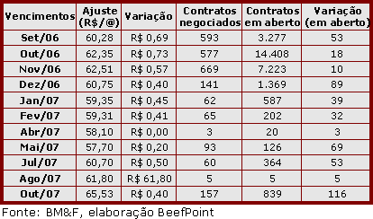 No total, foram negociados 2.425 contratos e houve aumento nos contratos em aberto em todos os vencimentos, além de abertura de uma posição para agosto/07, ajustada em R$ 61,80/@. O total de contratos em aberto subiu para 28.420, com destaque para outubro/06 com 14.408 contratos em aberto.