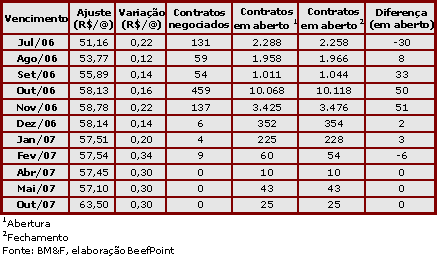 A BM&F teve valorização em todos os contratos futuros no boi gordo, dando continuidade ao movimento iniciado em julho. Os contratos para julho/06 fecharam em R$ 51,16/@ (+R$ 0,22), com 131 contratos negociados. O número de contratos em aberto (2.258 no fechamento) reduziu em 30. O contrato para outubro/06 acumula alta de 1,59% no mês e para julho/06, baixa de 0,31% no mês. O pregão teve 859 contratos negociados e fechou com 19.576 em aberto.