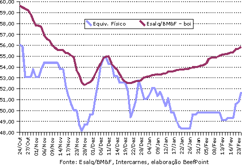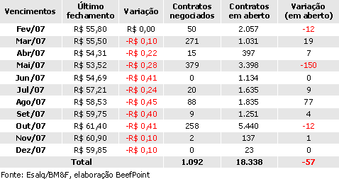O contrato para fevereiro/07 fechou inalterado em R$ 55,80/@, negociando muito pouco no dia, apenas 50 contratos. Este contrato será encerrado amanhã pela média dos fechamentos do indicador Esalq/BM&F desde 22/02, que, por enquanto, está em R$ 55,73/@, R$ 0,07 abaixo do fevereiro/07.