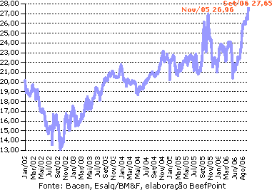Em um exercício matemático avaliando os atuais preços de carne in natura exportada (agosto/06) e os preços futuros do boi gordo na BM&F, a relação de troca @/tonelada é estimada em 88,14, 1,29% acima da mais baixa relação de troca desde 2002, ocorrida em outubro de 2005, 87,01 @/tonelada.