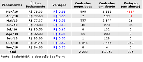 O mercado futuro fechou em alta com valorização em todos os vencimentos. Março/10 teve variação positiva de R$ 0,59, fechando a R$ 78,33/@. Os contratos que vencem em maio/10 terminaram o pregão valendo R$ 77,37/@ (+R$ 0,53) e os de outubro/10 tiveram alta de R$ 0,57, fechando a R$ 84,45/@.